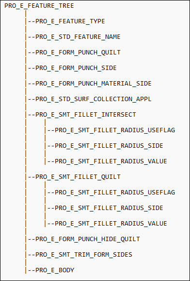 | • | PRO_E_SMT_BEND_RELIEF — Specifies bend relief. Refer to the section Feature Element Tree for the Sheetmetal Flat Wall Feature for more information on this element subtree. |